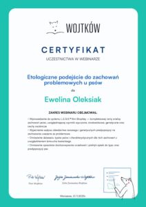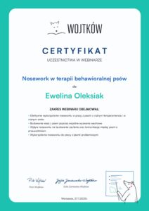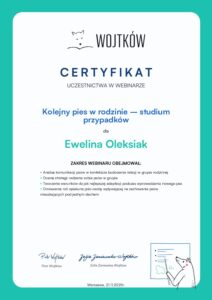 - Uczestnictwo w webinariach Wojtków szkolenia i Psiedszkole– „Praca Behawiorysty” , „Trening medyczny”, „Praca z psem schroniskowym” , „Agresja lękowa”, „Komunikacja psów” „Pieś Lękowy”, „Pies reaktywny”, „Ocena psów agresywnych”