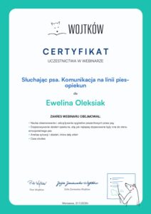 - Uczestnictwo w webinariach – „Pies Lękliwy” , „Pies reaktywny” u Agnieszką Grynkiewicz z Dogfulness