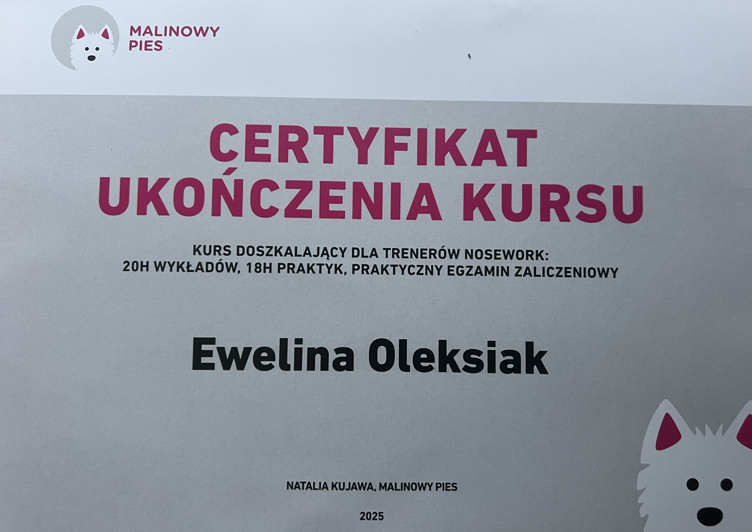 Poniżej znajdziesz moje kwalifikacje — potwierdzenie wiedzy teoretycznej i praktycznej. Bo choć certyfikaty są ważne, to właśnie codzienna praca z psami i ich opiekunami uczy najwięcej.