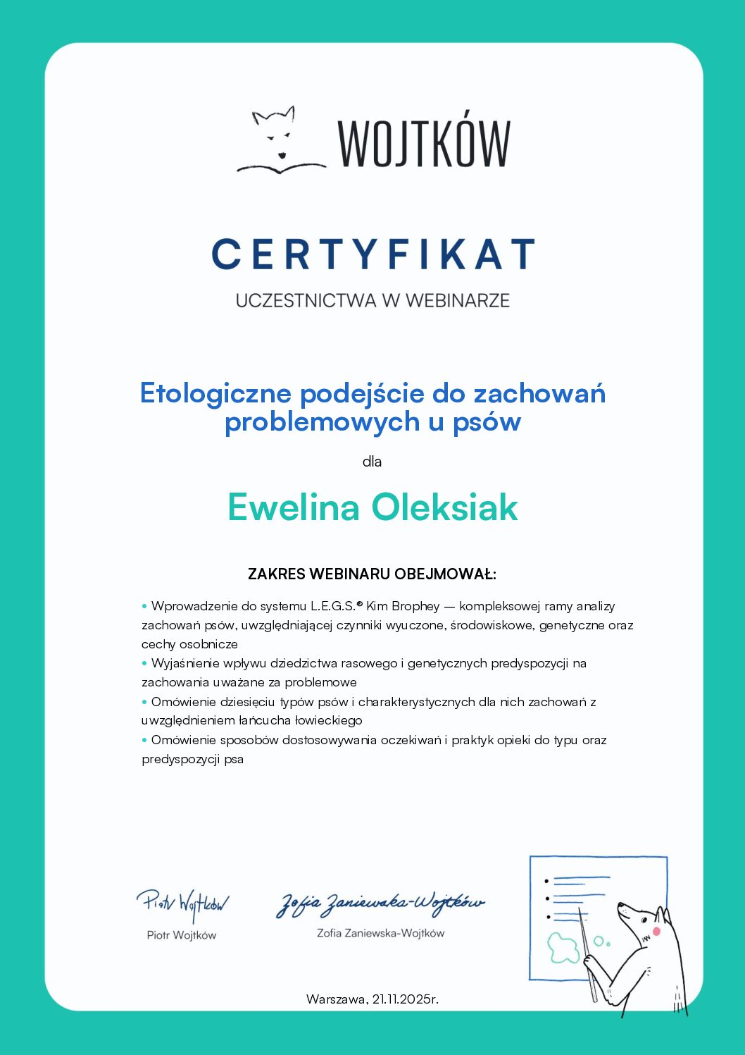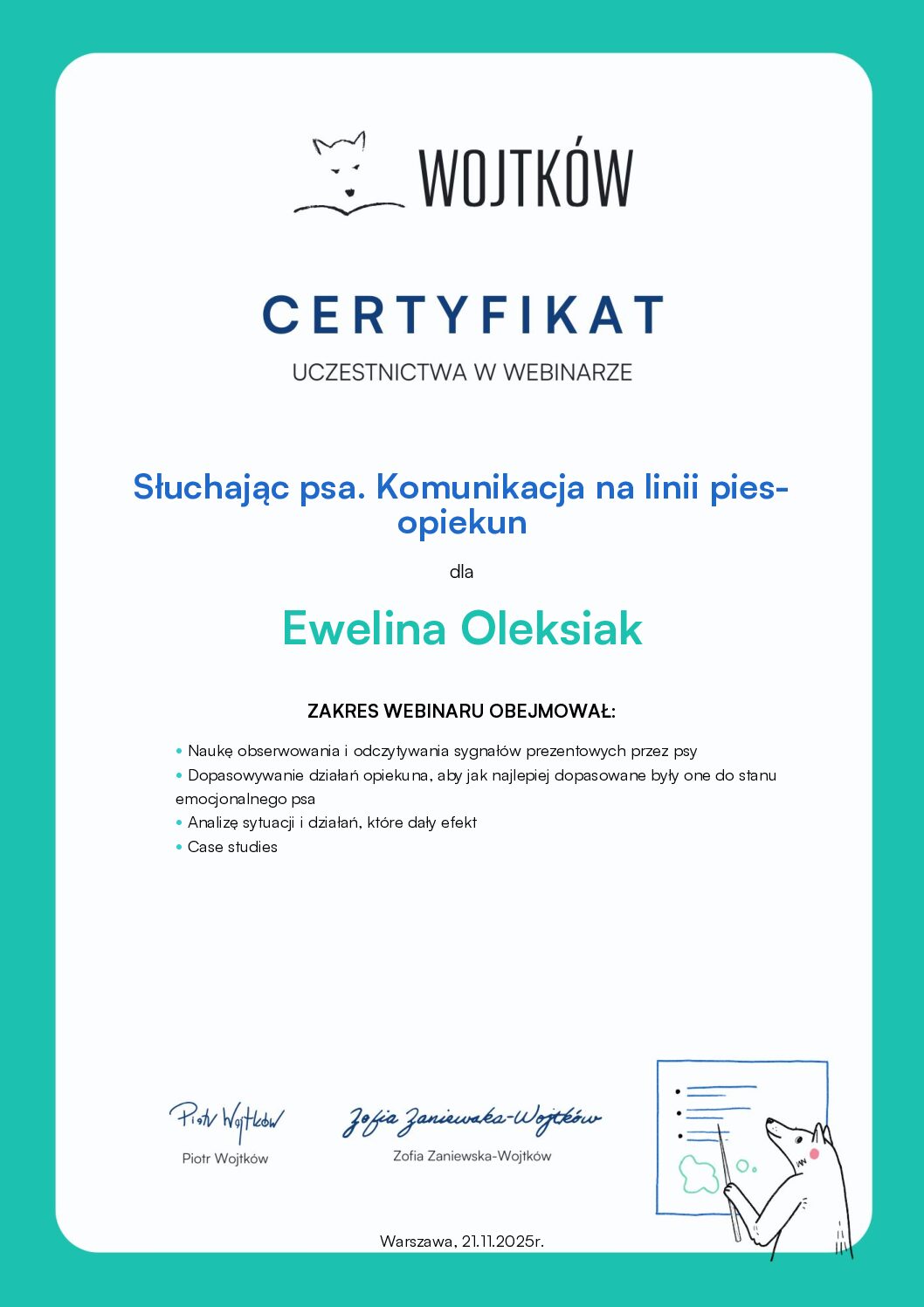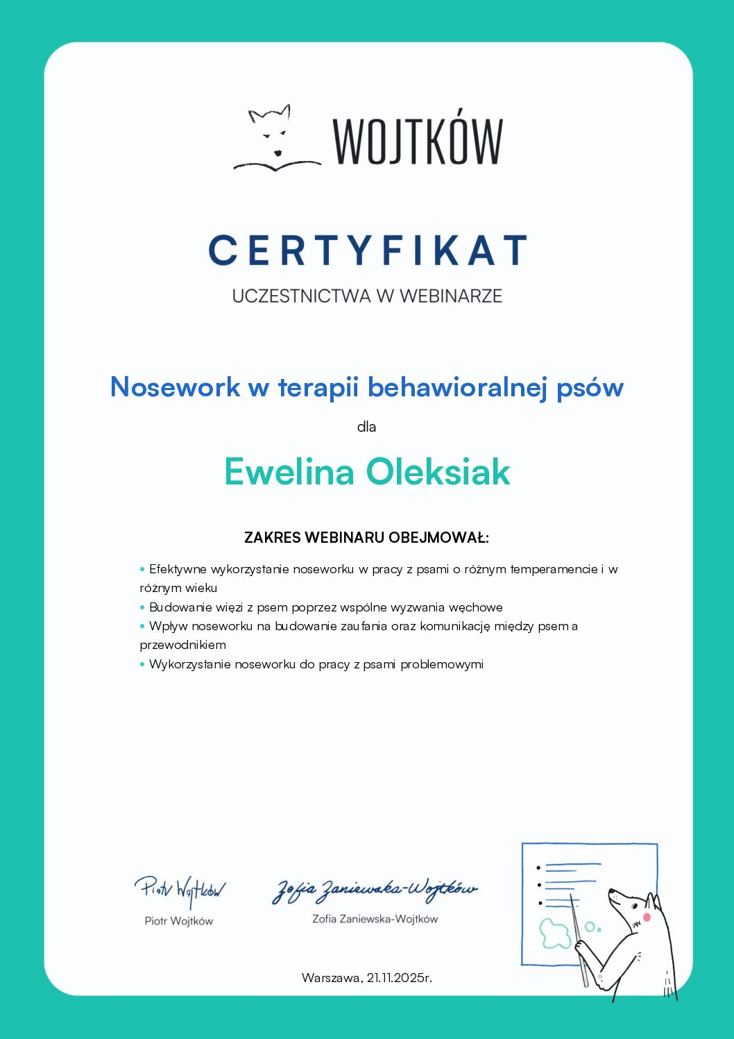 - Uczestnictwo w wykładach – „Spacerownik”, „Rozmowa z psem” – Wojtków Szkolenia
